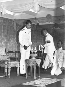 เครื่องนมัสการทองน้อย ในภาพ สมเด็จพระบรมโอรสาธิราชฯ สยามมกุฎราชกุมาร ทรงจุดธูปเทียนเครื่องทองน้อยในการบำเพ็ญพระราชกุศลทรงบาตร เนื่องในพระราชพิธีสถาปนาเฉลิมพระนามาภิไธย ณ พลับพลาท้องสนามหลวง เมื่อวันที่ ๒๙ ธันวาคม พ.ศ. ๒๕๑๕