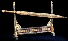ในส่วนของเครื่องเบญจราชกกุธภัณฑ์ของพระมหากษัตริย์ไทยนั้นมีปรากฏรายชื่อในศิลาจารึกเรื่องอภิเษกพระเจ้าเลอไทย เมื่อ พ.ศ. ๑๘๙๐ อยู่ ๓ สิ่ง คือ ๑. เศวตฉัตร ๒. พระขรรค์ชัยศรี๓. มงกุฎ ส่วนอีก ๒ สิ่งนั้นไม่ปรากฏว่าเป็นอะไร