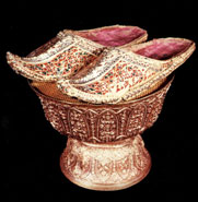 ๕. ฉลองพระบาท เป็นฉลองพระบาทเชิงงอน ทำด้วยทองคำลงยาราชาวดีฝังเพชร มีน้ำหนัก ๖๕๐ กรัม สร้างขึ้นเป็นเครื่องเบญจราชกกุธภัณฑ์ มาตั้งแต่ครั้งรัชสมัยพระบาทสมเด็จพระพุทธยอดฟ้าจุฬาโลก ในการพระราชพิธีบรม-ราชาภิเษก ในการพระราชพิธีบรมราชาภิเษก พระราชครูพราหมณ์พิธีเป็นผู้สวมฉลองพระบาทนี้ถวาย ส่วนในการพระราชพิธีฉัตรมงคล เชิญประดิษฐานที่ชั้นลดของพระแท่นราชบัลลังก์ ต่ำกว่าเครื่องเบญจราชกกุธภัณฑ์อื่นๆ